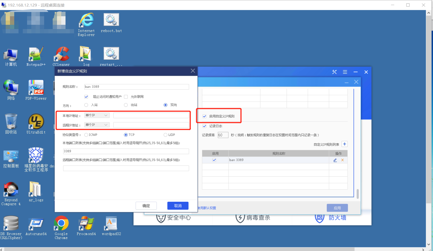 出现问题前的操作步骤: 设置中心--上网防护--IP规则--启用自定义IP规则--如下设置--规则没有生效