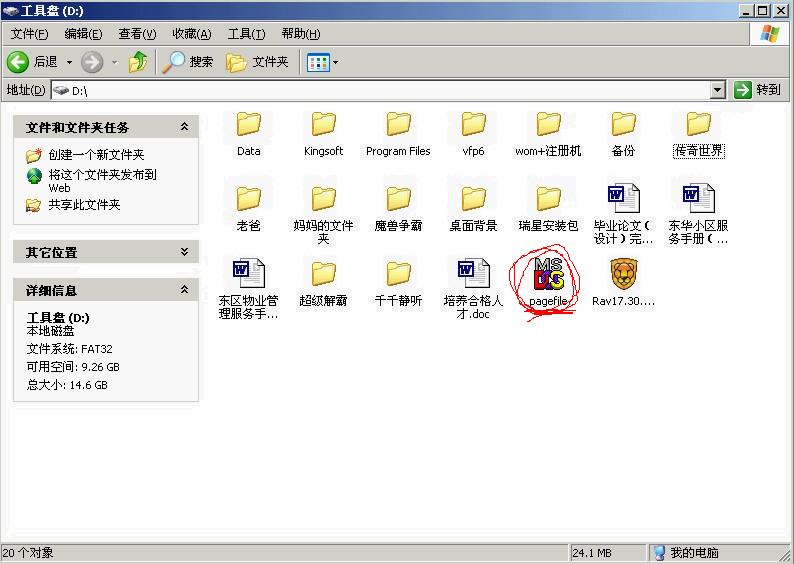 我这台机不知道中了什么病毒,最新版瑞星也查不出任何病毒,而且瑞星防火墙也不知道怎么被破坏了,监控开不了,还有D盘变成自动播放了,里面多了一个文件:pagefile