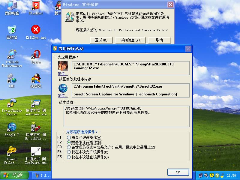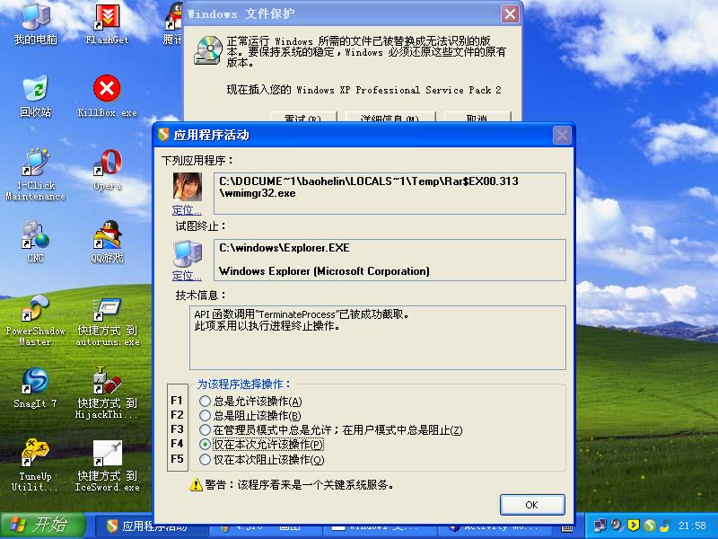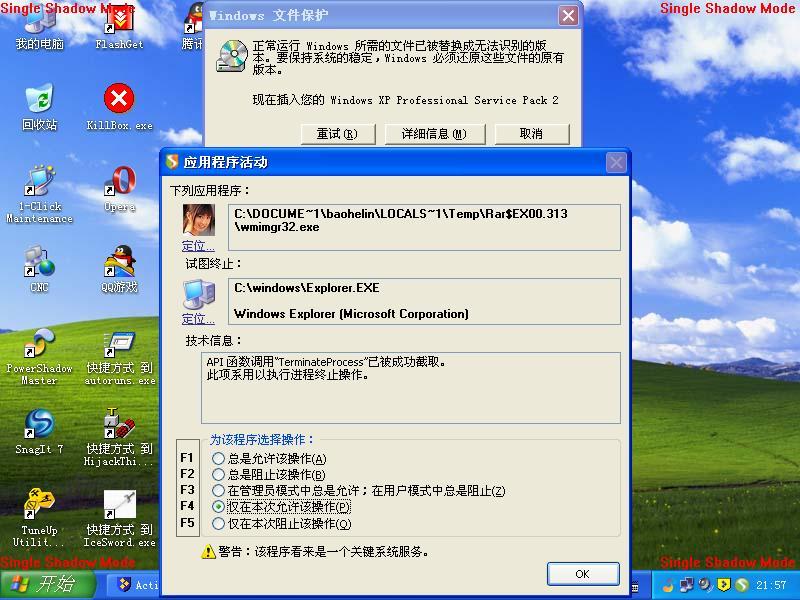 在powershadow的保护下,观察了一下这个蠕虫的感染过程。果然很变态。中招后,系统基本上就残废了。有系统光盘的,杀毒后,就用光盘修复系统吧。没系统光盘的,有系统GHOST备份也行。