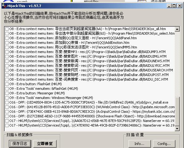 汉化的hijackthis是v1.97.1,我用它扫描不到Backdoor.Gpigeon.uql的任何迹象,日志只查到017项,看下面的图!!!