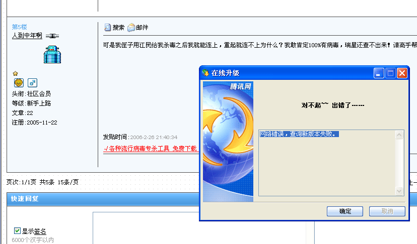 可是我侄子用江民给我杀毒之后我就能连上,重起就连不上为什么?我敢肯定100%有病毒,瑞星还查不出来!请高手帮帮我啊!