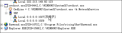 今天看瑞星防火墙的系统状态里面最后一个svchost.exe下的UDP有下面的东西,我抓了图大家看看,是什么,该东西对应的注册表我删除了,用HijackThis1991zww.exe扫描没有了,用卡卡安全助手扫描也没有。(未删除注册表前用安全助手可以扫描到)高手救我!(图片点击放大看)