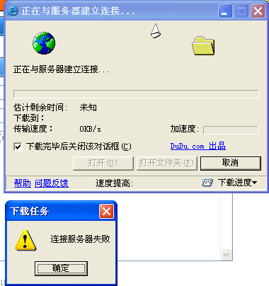 前段时间上新浪下载游戏,遇到DUDU加速器,当时拒绝安装,结果现在每次用左键下载文件时跳出的下载窗口如下,而且连接一段时间后告诉我连接服务器失败。妈的,现在左键是报废得了。气得偶打电话去客服那里臭骂了一顿。