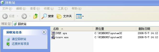 3、删除C:\WINDOWS\system32\文件夹中的SVKP.SYS和tcsrv.exe