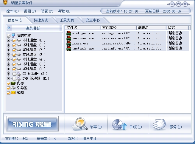 给别人下MP3后,提示有病毒,瑞星杀了,杀了重起还有,百度了一下,都说的很含混,能解决问题的少,MMSK升到最新病毒库,说是伪系统木马.