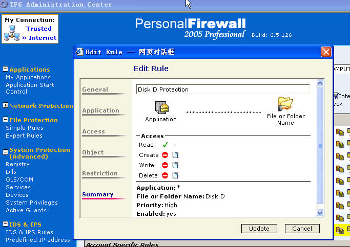 在TINY的Administration Center中,有一栏File Protection,此栏下有“Expert Rules”子栏。点击“Expert Rules”,自己添加防护规则,禁止任何程序写、建、删除各硬盘分区的任何文件(例子见附图)。