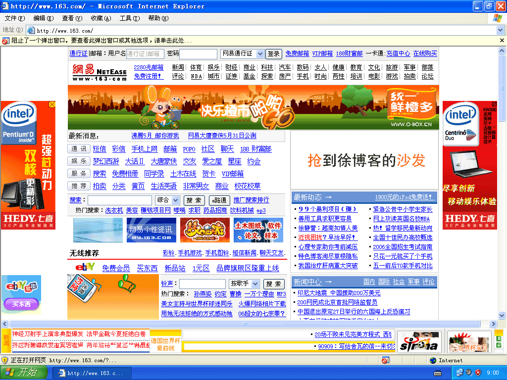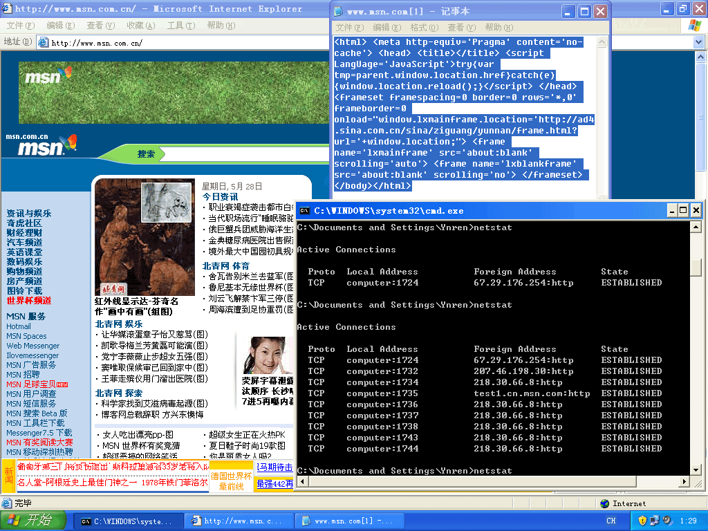 当我回到家后,打开我个人台式电脑。接入电信东郊38区ADSL网络。打开默认网页 http://www.microsoft.com/isapi/redir.dll?prd=ie&pver=6&ar=msnhome 打开后自动跳转到 www.msn.com.cn 时同样出现了浏览器(IE)下端被新浪广告劫持....这是我开始对我的系统不放心了。而且我还打了一个电话给了我一个开网吧的朋友。他说还没发现这个问题。之后试着打开其它中国门户网站.....还是会出现浏览器(IE)下端被新浪广告劫持。概率测算了一下在5%左右。不放心的我开始用以前系统GHOST文件开始恢复系统,这个时间已经是23:10了,我用了6分种将系统恢复。进入系统第一个打开默认网页 http://www.microsoft.com/isapi/redir.dll?prd=ie&pver=6&ar=msnhome 打开后自动跳转到 www.msn.com.cn 时同样出现了浏览器(IE)下端被新浪广告劫持。