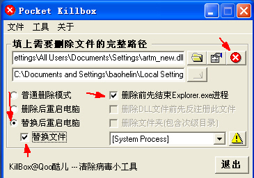 既然如此,可以尝试用KillBox强行删除C:\Documents and Settings\All Users\Documents\Settings\artm_new.dll。