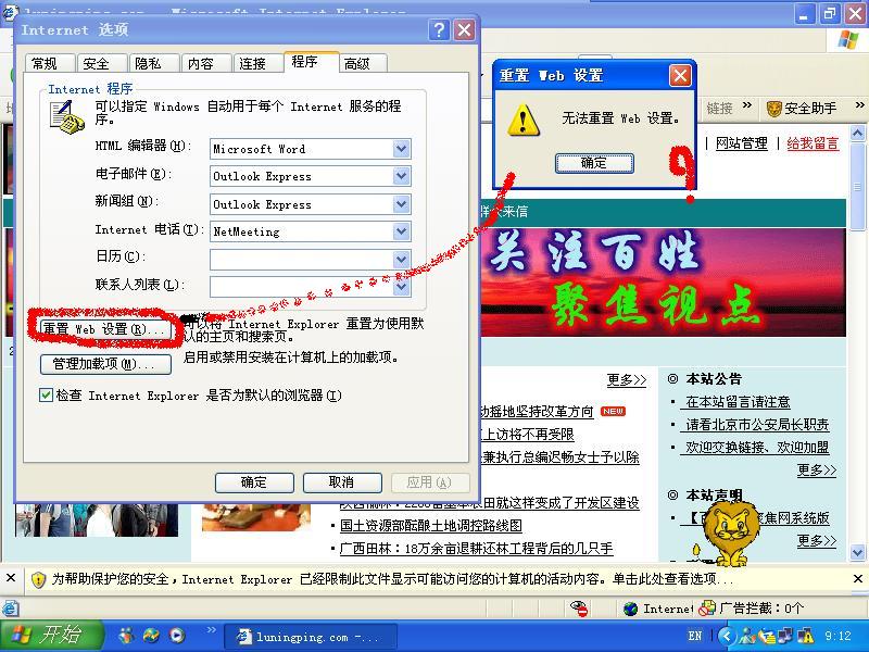 系统:SP2,IE6,我想将IE设置成使用当前页,但设置后不起作用?且在Internet选项中的重置web时无法重置?先谢谢指教啦!!!