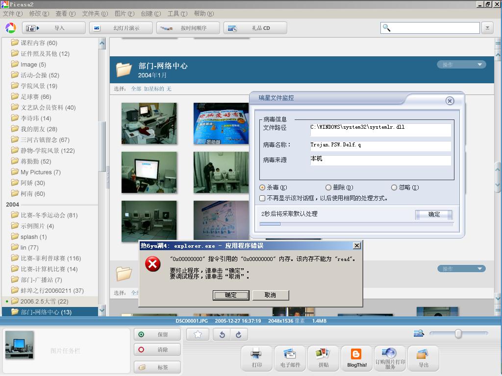 使用google的图片管理工具picasa的从磁盘查找功能时候就提示发现Trojan.PSW.Delf.q病毒!并提示热6yu湖4;explorer错误!看下图