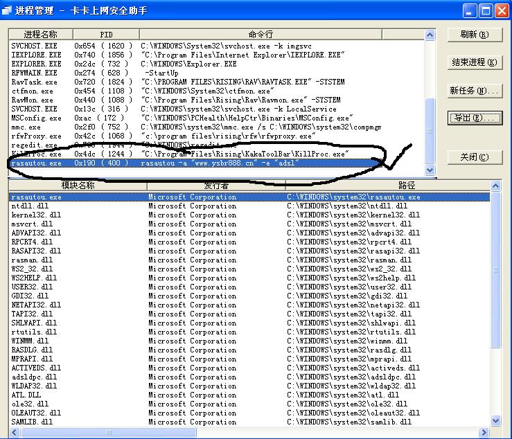 我已在卡卡进程管理中关了好多次了,但还是又自动加载,又把rasautou.exe文件也删了,还是不管用!!下面是卡卡里的截图,请懂的朋友给指点一下,谢了!