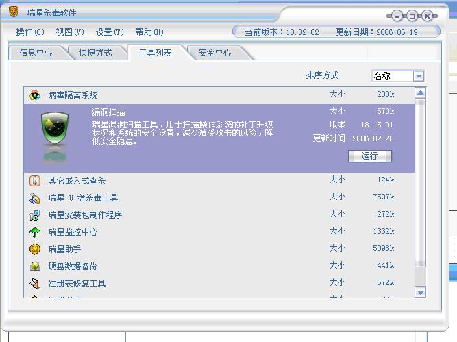 我的漏洞扫描版本如图。我将瑞星杀软升级到最新版本18.32.02 ,可惜漏洞扫描仍是“版本 18.15.01 更新时间 2006-02-20”。我苦等了四个月,瑞星始终没有将漏洞扫描升级。