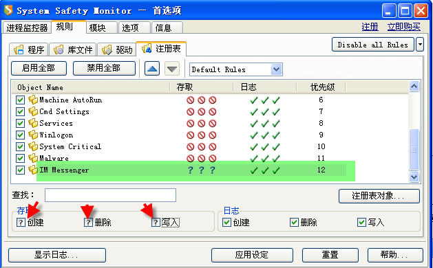 因为malware组包括的注册表监控项目都是禁止创建、删除、写入的(图2)