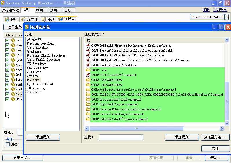 SSM,自2.1.0.574开始,注册表监控做了合理改动:将注册表监控移到了“规则”中,并分门别类管理,很好。