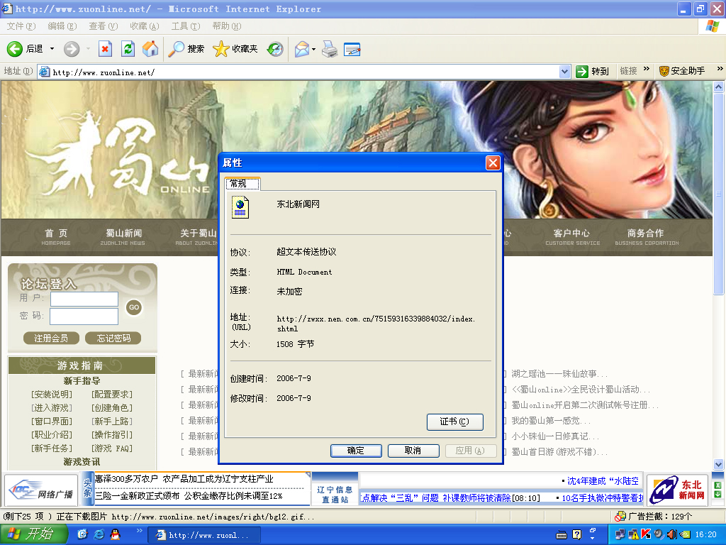 不知道具体从什么时候出现的 大概不会超过半个月 请注意看最下面那条什么东北新闻网的东西 右键点属性出来的就是上面点那个 这个东西不是每次打开网页都会出 也不是打开某个站才出 打开什么站都可能出 是随机的 看着很烦人 最讨厌这种恶心的东西了