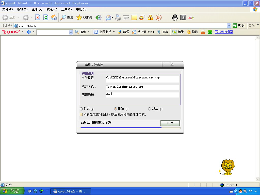 我的电脑中了Trojan.Clicker.Agent.abu病毒,每次打开网页瑞星都会提示发现病毒(如图),删除病毒后瑞星提示删除成功,但再次打开网页仍然发现还有这个病毒,下面是扫描日志,请高手帮忙看一下,感激不尽!!!