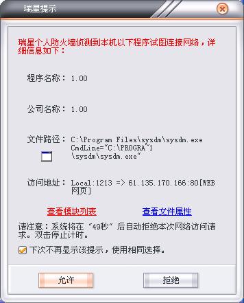 如图:瑞星个人防火墙总能测出 程序名称:1.00