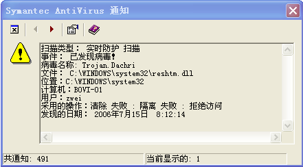 用江民杀。。。结果显示是SYS32里面的。。。trojan.dachri_A病毒 但是却杀不了。。
