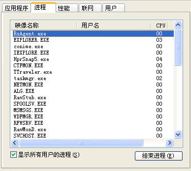 除了灰鸽子之外,帮忙看看有没有别的,我打开任务管理器,在进程这一条里,只有映像名称,看不到与进程相对应的用户名显示,用户名一列全部空白