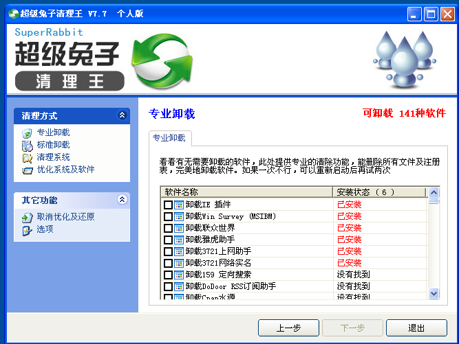 安装好后,打开“超级兔子清理王”“专业卸载,卸载所有提示的垃圾软件,卸载是不要打开任何浏览窗口。卸载不了可以重启后再去卸载。