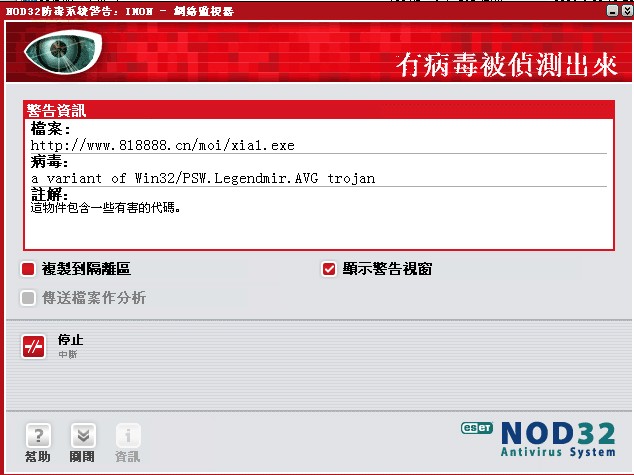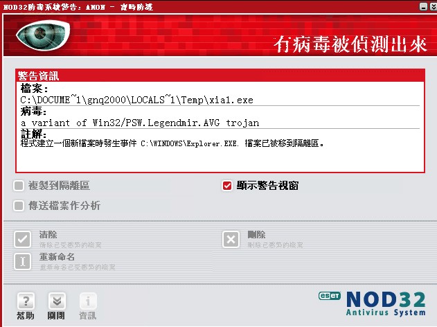 O4 - 启动项HKLM\\Run: [nod32kui] "C:\Program Files\Eset\nod32kui.exe" /WAITSERVICE