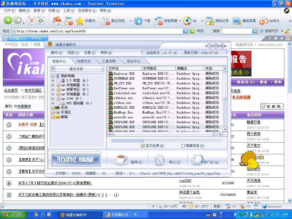 重新启动后网站什么的都可以开咯,可又出了这个新的状况...只要一开IE,瑞星就猛提示发现病毒Backboor.Gpigeon.2006.po....是连续不断的提示有这个病毒...我对这个不是很懂噢,就先更新了瑞星来杀毒一下...杀出好多噢...