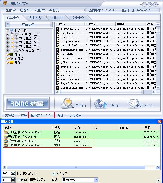 这病毒没进注册表...可轻易的用杀软删除...但是杀软又杀不干净...