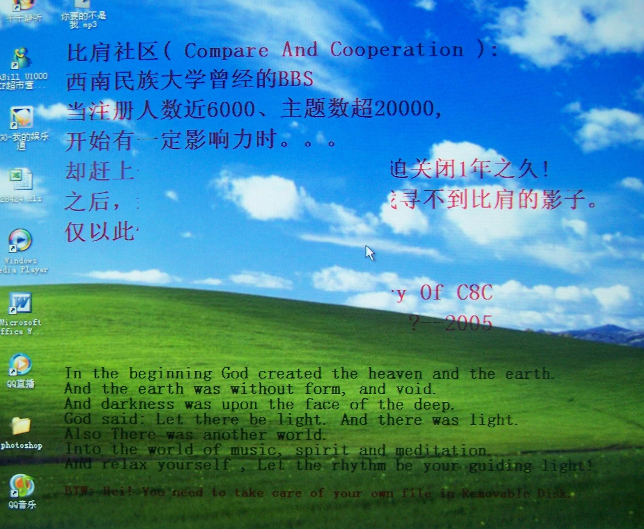 小弟我今天用了别人的U盘结果就糟了,每次开机的时候,桌面就会出现下面图片上的字,我用瑞星杀了一次没发现一个病毒,然后我又在安全模示下也杀了一次,还是没有发现任何东西,不知道是什么东西,图片上其中一段话是这样说的:Hei,You need to take care of your own file Removable Disk.我看后吓糟了,下面是小弟的日志