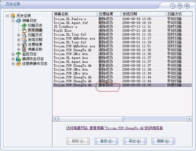 Trojan.PSW.ZhengTu.dk这种病毒处理结果上写着“重新启动”,我重启后,瑞星的小绿伞