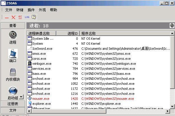 看起来很简单吧,这病毒聪明之处是隐藏的进程,不过,好在逃不过IceSword的眼睛。