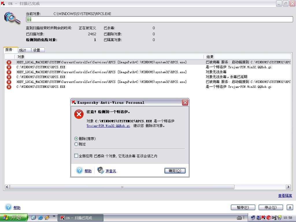 早上醒来,突然中招,用卡巴杀不掉,急问: