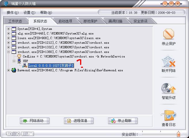 大家帮我看看,在你们的机子中,瑞星防火墙的“系统状态”选项里有没有这个东西?