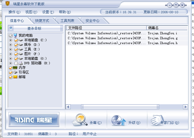 我有电脑有这三个这样的病毒Trojan.ZhongSou.i Trojan.ZhongSou.g Trojan.ZhongSou.h用瑞星杀毒软件删除后.但重启电脑用瑞星再查杀后但是还有这三个病毒.请帮忙解决下.