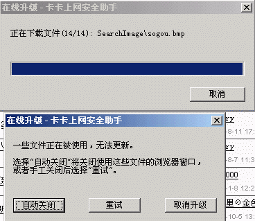 我的卡卡安全助手更新到最后也就是第14个文件的时候,就弹出一个框框,说有程序在运行,要求关闭。我点了自动关闭后,就首先把网页关了,隔了一会又出一个对话框,又说有程序在运行,要求关闭。框框里面有个程序就是rundll32.exe。我选择了,然后点自动关闭,紧接着更新的框框就变成了没有反应。大约10分钟后弹出一个对话框,说以上程序正在运行,无法关闭。然后就是不了了之。这样的升级,我重复了N次,每次都这样。期间杀毒2次,发现一个毒Trojan.PSW.QQPass.prq。安全模式下第二次重新杀就没发现毒了。以下是我扫描的记录: