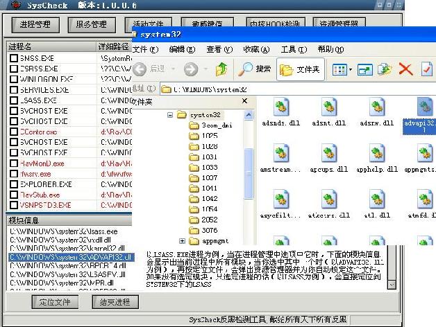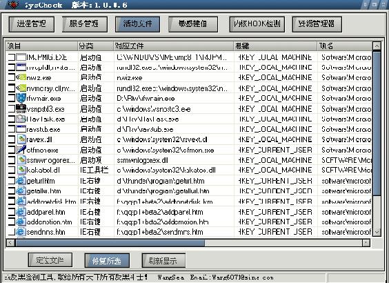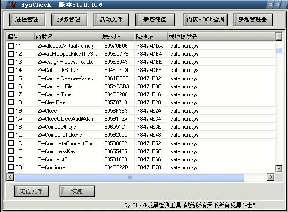由于底层Hook的优先级很高,所以恢复了SSDT后,可能会有一些隐藏的进程或文件会显示出来,故可以在恢复SSDT后再次观察各检测页状况以删除受这些驱动隐藏、保护的进程,注册表项等。[img][/img]