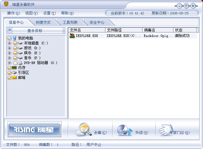 Backdoor.Gpigeon.ysi 清除成功 手动扫描IEXPLORE.EXE>>C:\Program Files\Internet Explorer\IEXPLORE.EXE本机