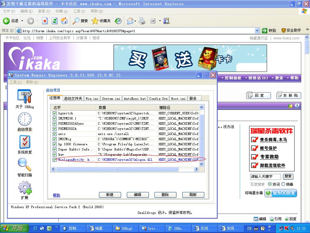 我用我的笨办法好像删了2.exe和d1d3e.exe,但好像用卡巴斯基用点卡,还有就是开机后不久,卡巴斯基会提示如下图