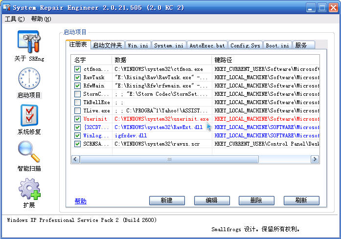 System Repair Engineer(SREng)提示我,我的系统(XP sp2)注册表值UserInit被改为非正常值,然后我用瑞星最新版杀毒却怎么也杀不出来!不知道是怎么回事儿,请大家帮帮忙……谢谢……!