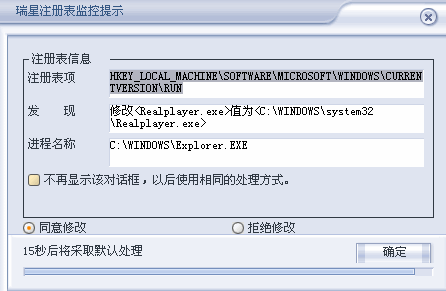 第一次查出来了,可是不一会儿瑞星又跳出realplayer.exe修改。