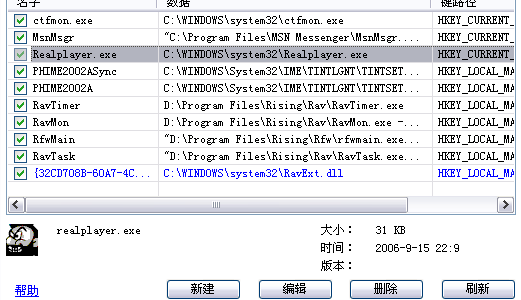 刚才打开一个电影网站www.1000ys.com,瑞星闪了两闪,注册表被修改了,来不及拒绝。于是用日志分析了一下,启动项多了个realplayer.exe,我点删除后马上又产生一个新的,郁闷!