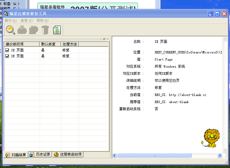 我的IE也中奖了.用瑞星注册表修复工具修复后,再扫描仍然存在.并且,还可以把瑞星的监控关闭.无奈