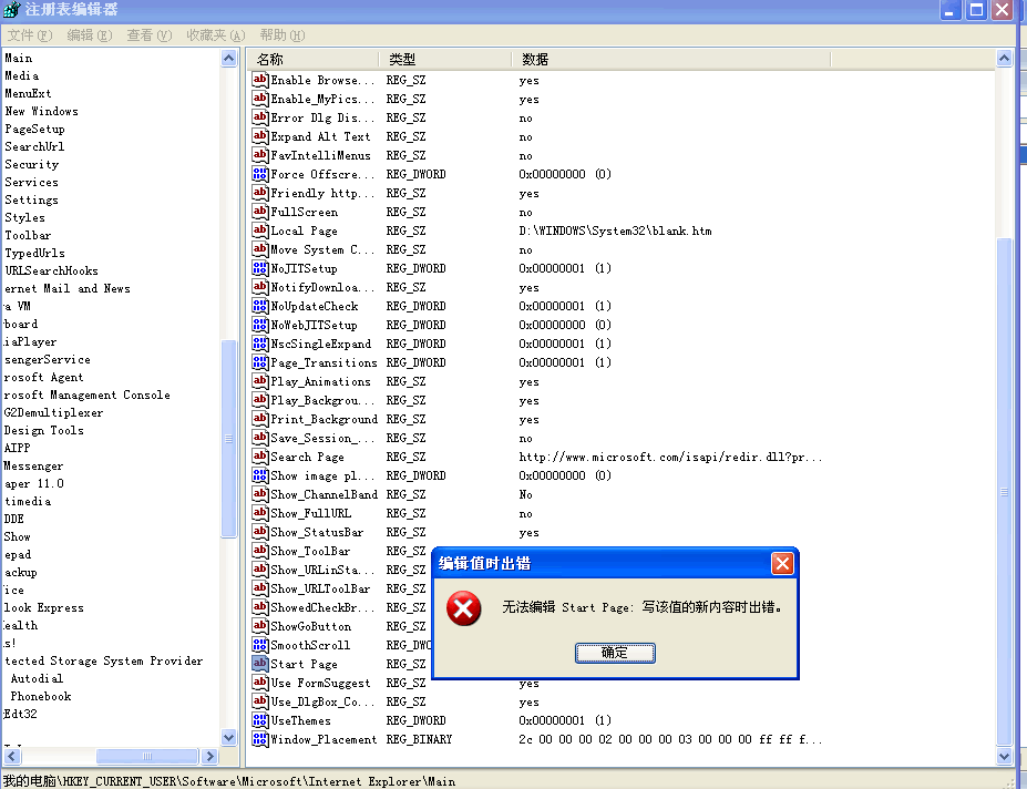 HKEY_CURRENT_USER\Software\Microsoft\Internet Explorer\Main,在右半部分窗口中找到串值“Start Page”,然后按(2)中所述方法处理。