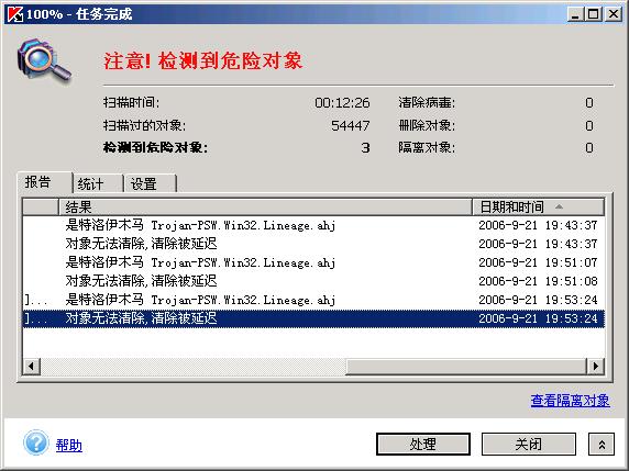 当用卡巴斯基杀毒却能查出来(看下面的图),好家伙,6个木马!杀毒后瑞星的“瑞星监控中心”也正常了。呵呵。看来关键时候还要卡巴来救瑞星啊。。。