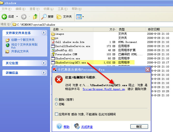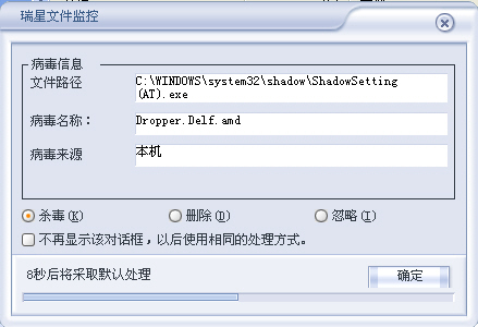 5、再用瑞星扫一下这个ShadowsSetting(AT).exe,同样也报毒(图5)。