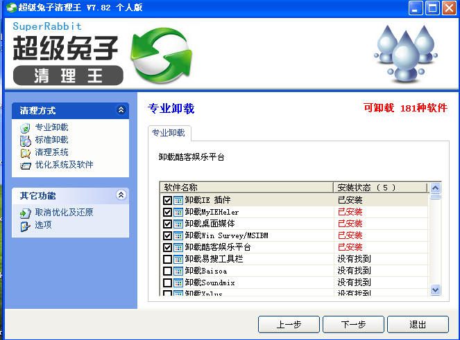 安装好后,运行超级兔子,点击主界面超级兔子清理王,点击左侧“专业卸载”,卸载所有安装状态为已安装的软件。卸载时不要打开任何浏览器和文件窗口。