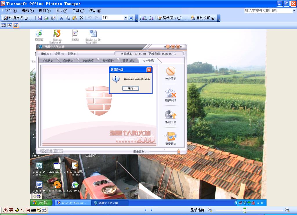 每每一点“智能升级”,瑞星(包括杀软和防火墙,下同)的反馈的提示不外乎几种:1)网络忙,请选择其他时间升级;2)你已超过升级次数。。。。;3)你已经是最新版本(这条信息大多时不假);4)以及如图1、图2所示的“请检查网络设置….”或“….invalid new check URL….”(“无效的新检测地址…”).