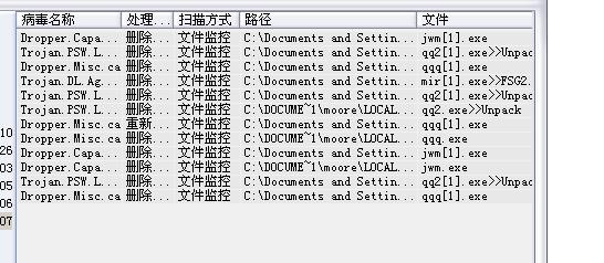 Dropper.Misc.ca 删除成功 文件监控 C:\Documents and Settings\moore\Local Settings\Temporary Internet Files\Content.IE5\J71FFDOS qqq[1].exe