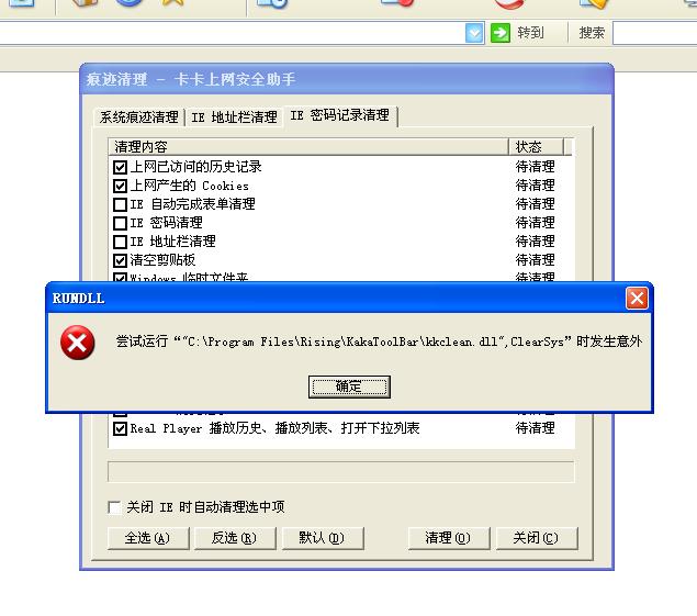 用卡卡助手清理IE密码时出现问题