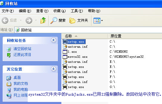 关闭IceSword。自己动手删除C:\windows\1.exe、C:\windows\system32\msvce32.exe以及其它分区根目录下的autorun.inf、Setup.exe。其它被感染的.exe中的病毒代码能否被杀软“清除”——不得而知。如果不能,只好删除。
