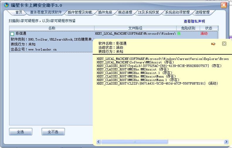 卡卡扫描到了一个可疑软件“彩信通”,可怎么也清除不了???怎么回事。。